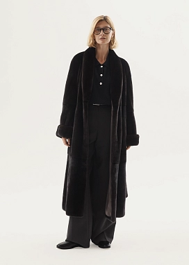 Длинная норковая шуба из аукционного меха коротковорсовой норки в редком лакричном оттенке, переливающемся в зависимости от света угольно-черными и ореховыми бликами. Шуба дополнена изящным шалевым воротником, переходящим в борт изделия, и широкими меховыми манжетами, длину которых можно менять по желанию, меняя длину рукава.
