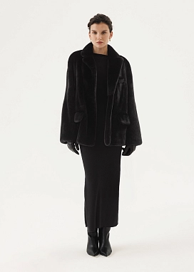 Жакет из выполнен из коротковорсовой скандинавской норки в роскошном черном цвете, дополнен прорезными карманами с клапанами и потайной застежкой на магнитные кнопки.
